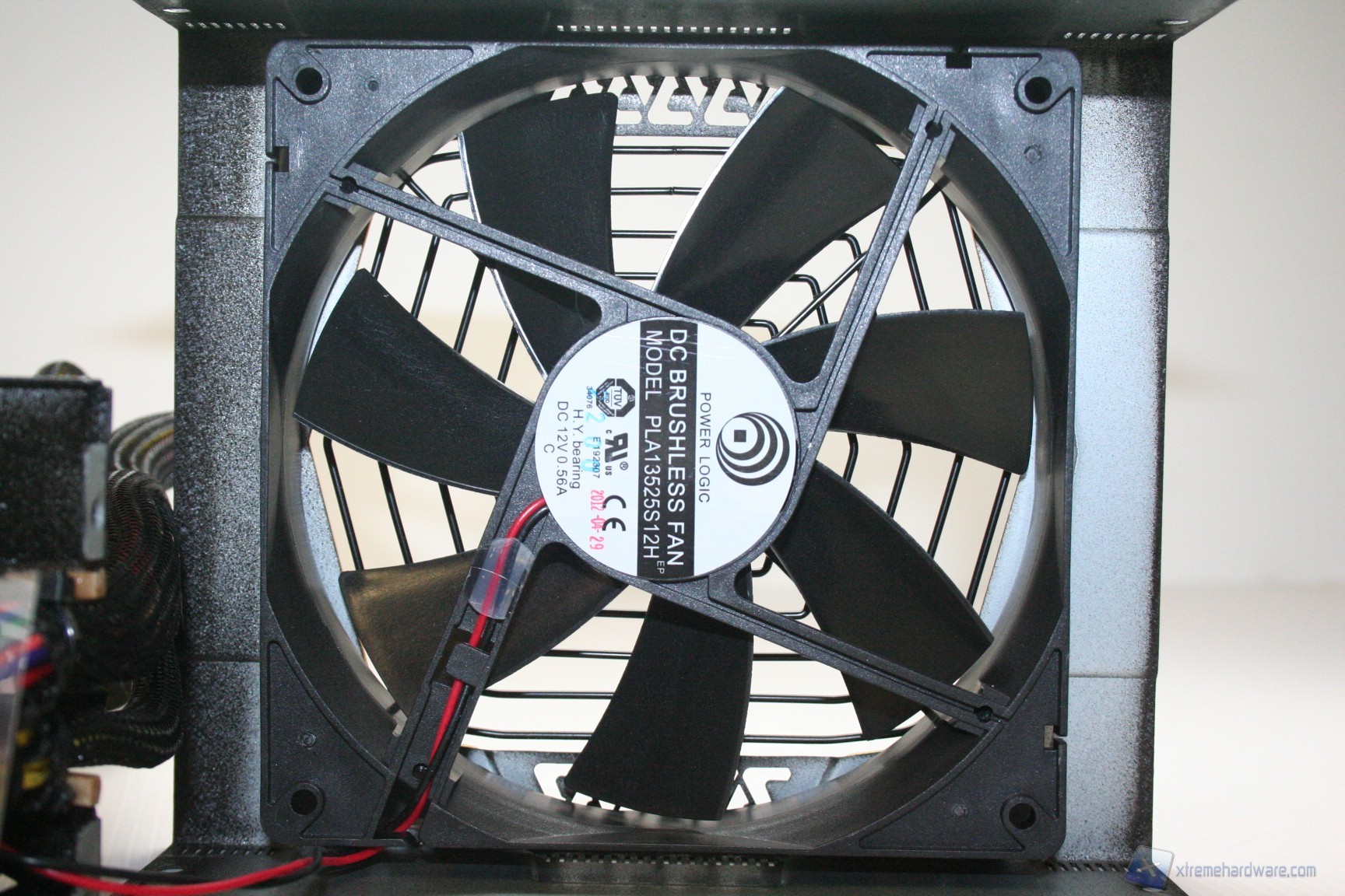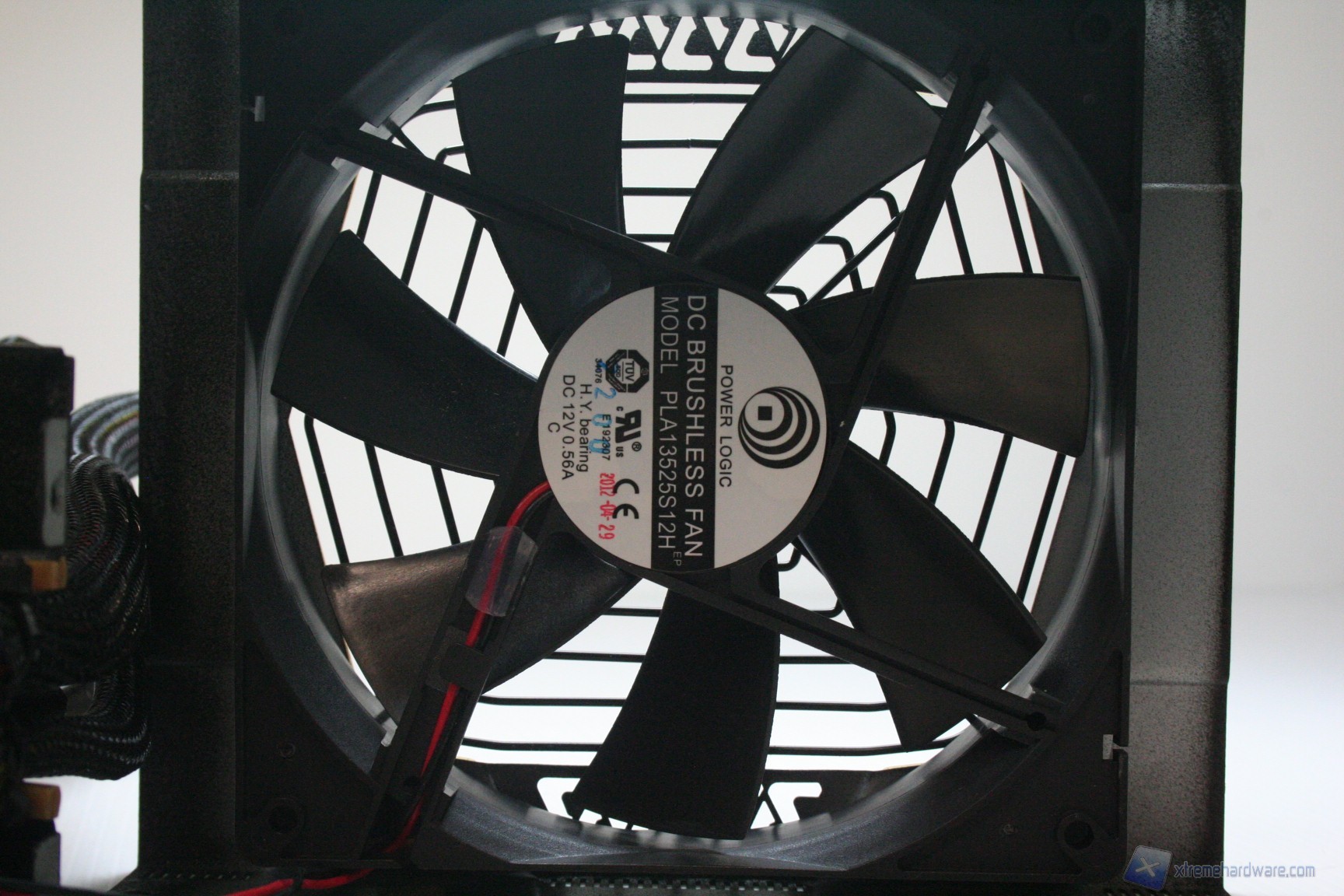 Si è scelto di adottare una ventola del produttore Power Logic, precisamente la PLA13525S12H, avente queste caratteristiche: DC12V, 0.56A, 117CFM massimo ed un bearing della tipologia HDB, quindi silenzioso e durevole. La conformazione è classica a 7 pale ed il colore è nero. L’alimentatore è silenzioso fino al 40% circa del carico, dopo questo valore si comincia a sentire ma diventerà problematica solo a valori prossimi al 100%, che comunque rappresentano una situazione difficilmente raggiungibile in un normale utilizzo. Possiamo quindi promuovere l’alimentatore sotto questo punto di vista dato che in molti casi, qualora ci fosse del fonoassorbente all’interno del cabinet, potrebbe addirittura non essere distinguibile dal resto del sistema. Data l’assenza di un simulatore di carico dedicato, purtroppo non possiamo fornirvi misurazioni dirette, anche perché la rumorosità del sistema di test era molto superiore a quella dell’alimentatore. Comunque sia la rumorosità non sarà una peculiarità di questo modello, perlomeno entro gli 800W.